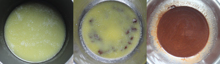 Pour the melted butter into the bowl with the chocolate and let it sit for 1 minute. Then whisk the mixture until combined. Immediately whisk in the egg, sugar and vanilla. Stir in the salt.